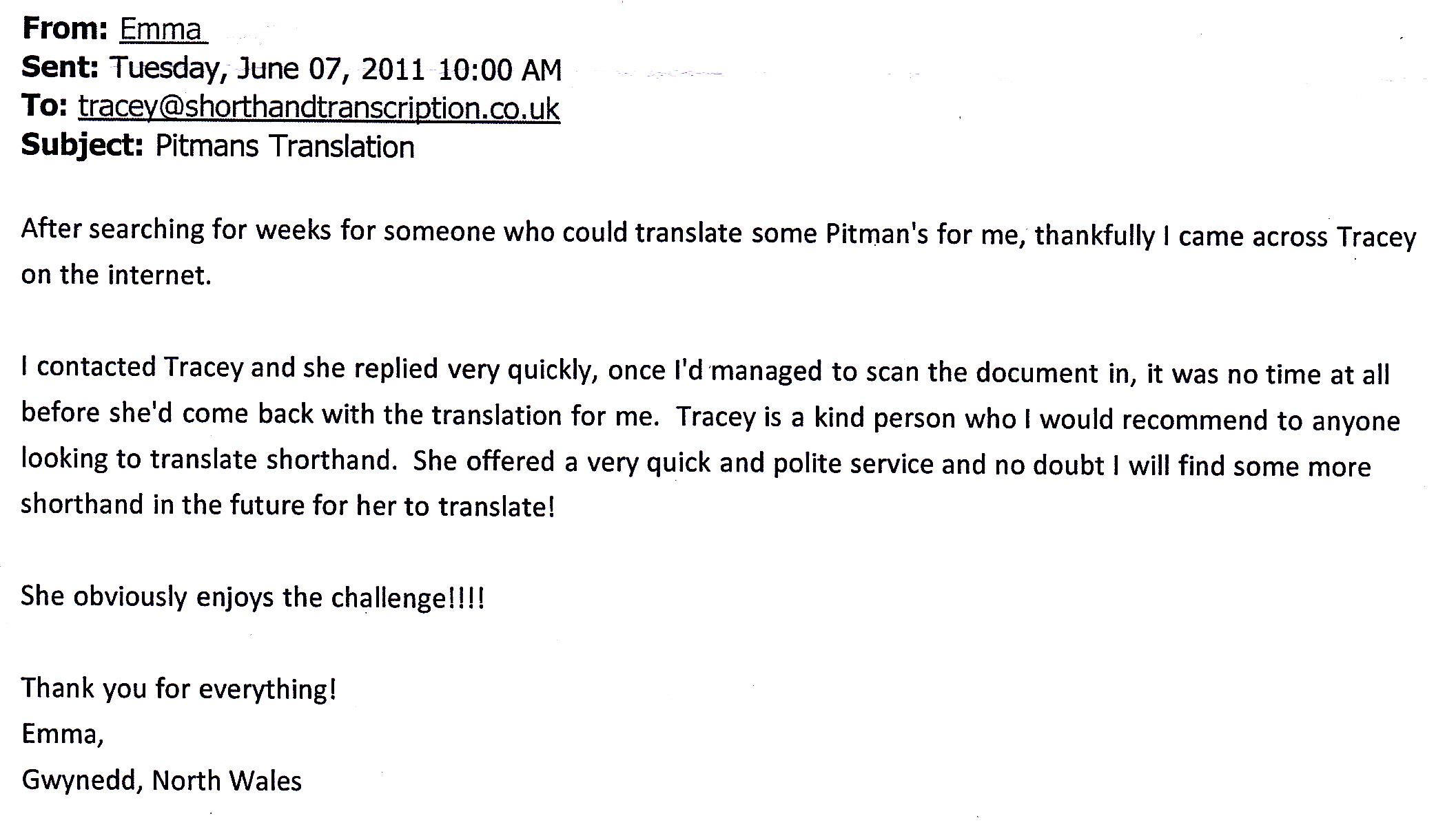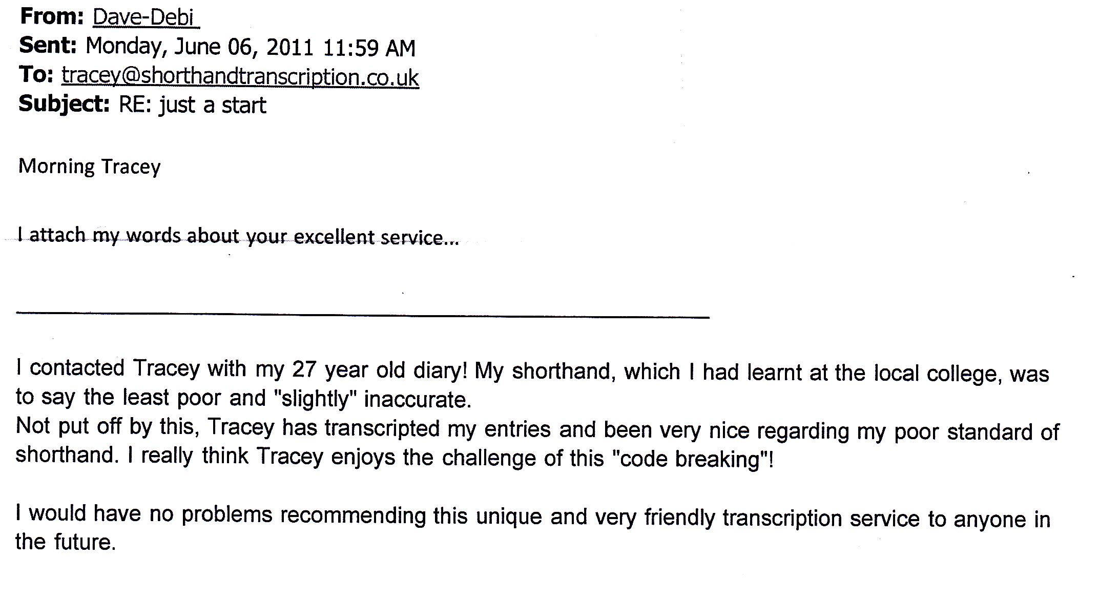 Tracey has been able to translate my late wifes Pitman shorthand (circa 1966) notes accurately, promptly and at a very reasonable cost. I have no hesitation in recommending the service Tracey provides.